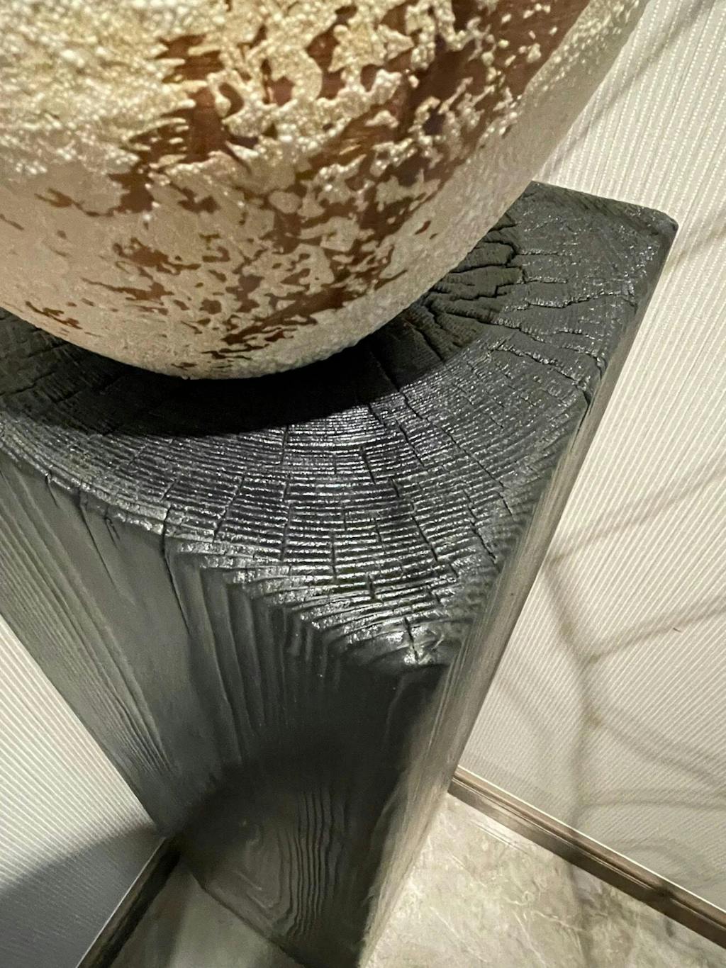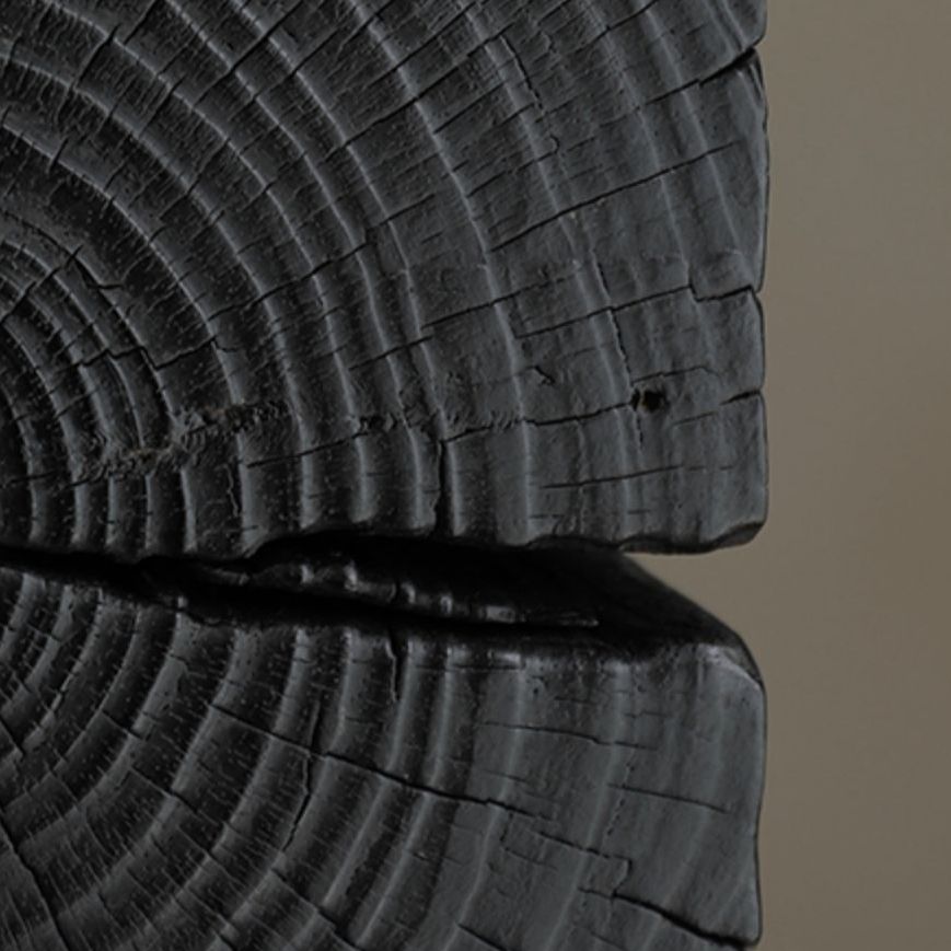 Each charred wood pedestal is unique, with organic patterns, mineral streaks, and surface variation that add raw, sculptural presence to any space.