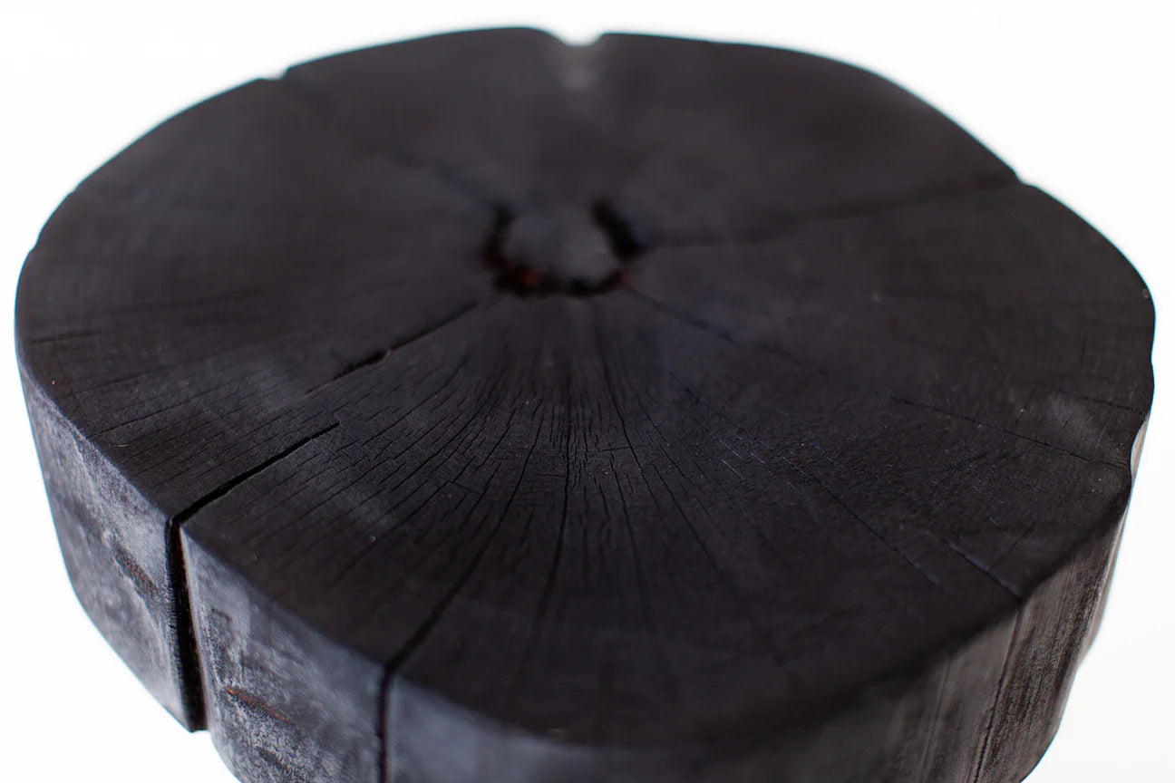 Elevate your interior with this bold and sculptural charred wood side table, hand-carved from solid wood and finished using the traditional Shou Sugi Ban fire-treatment technique. The result is a rich, matte black surface that celebrates natural texture, cracking, and wood grain variation.
