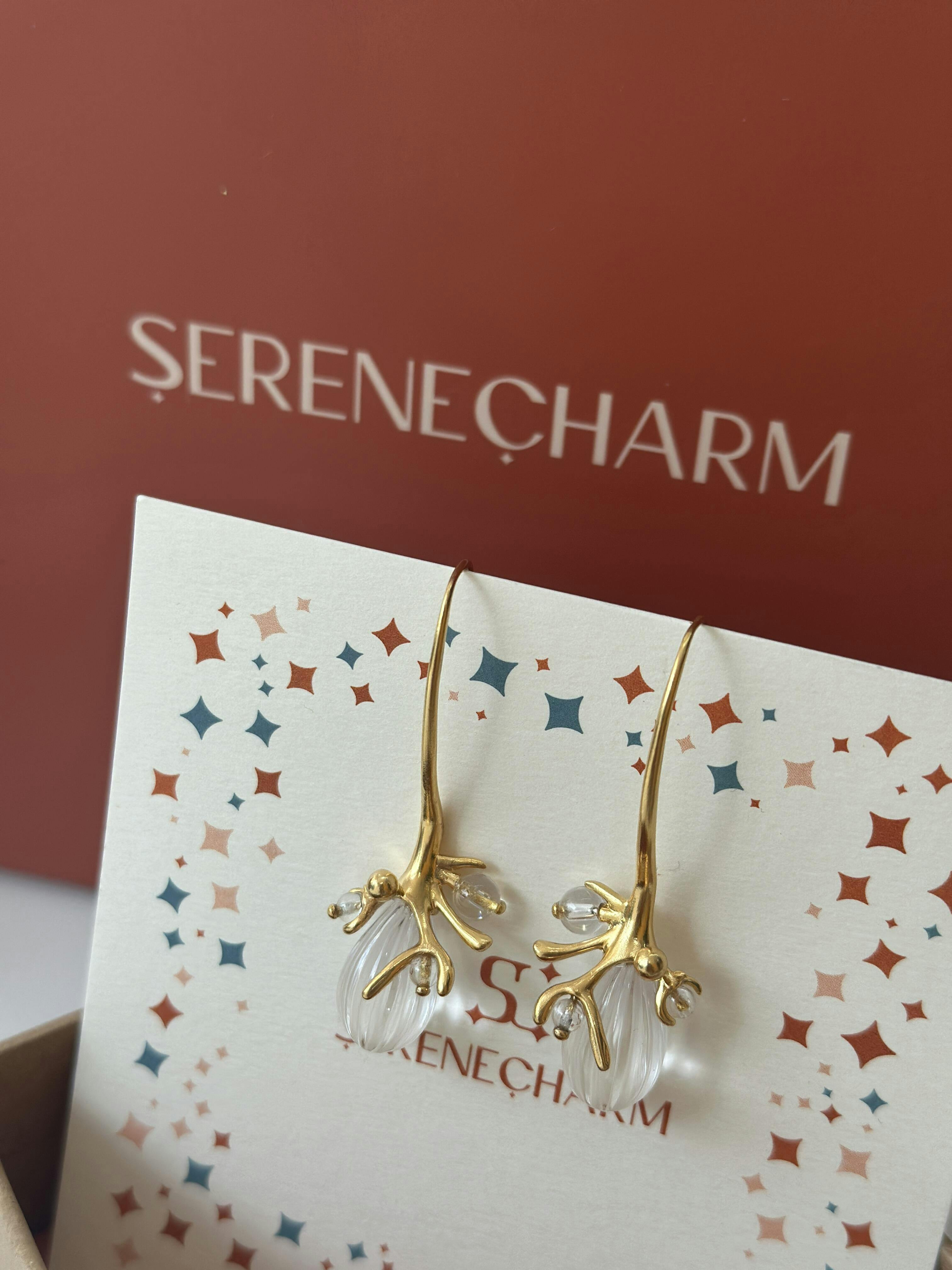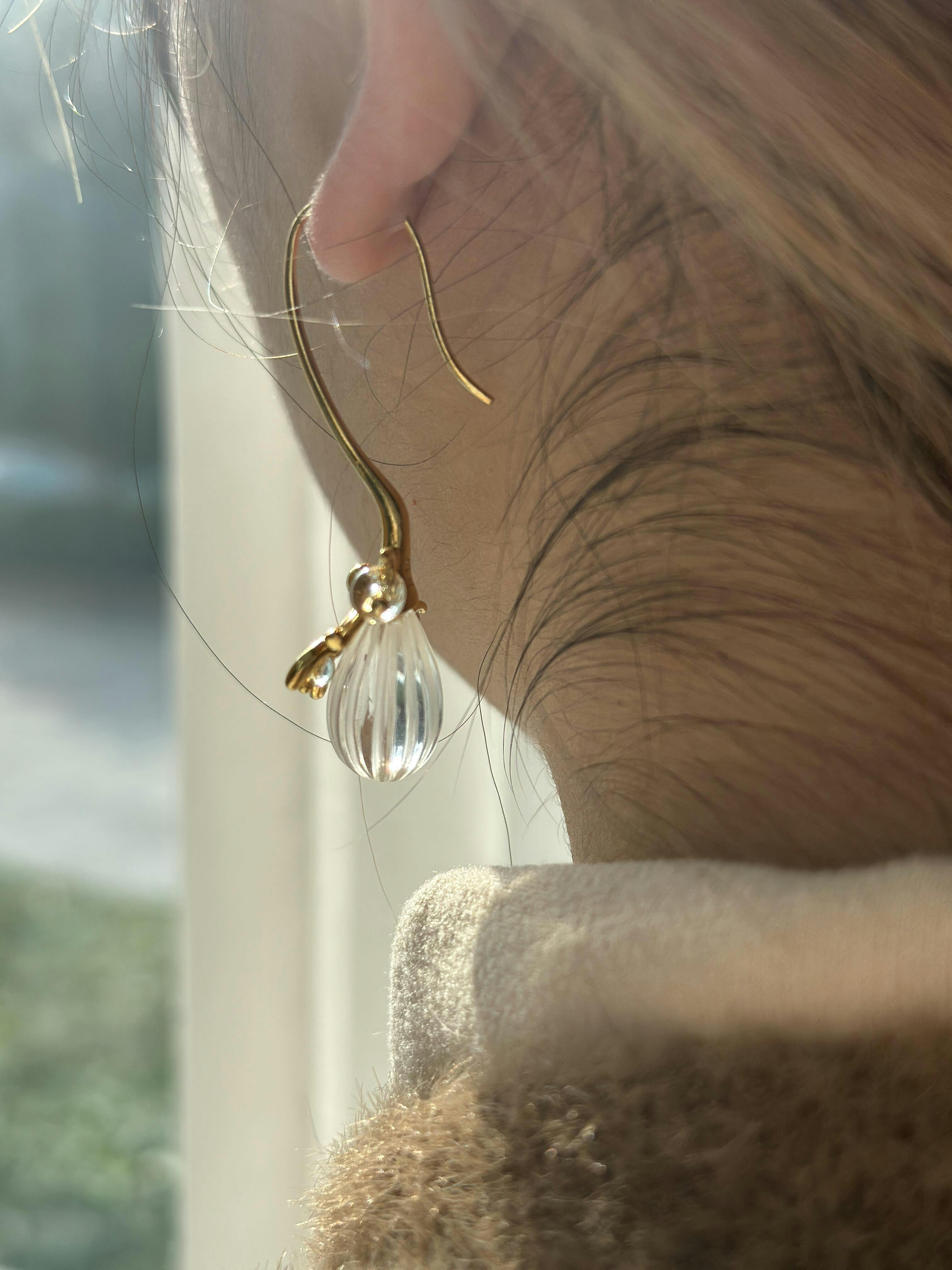 Capturing the organic beauty of mistletoe, this pair of earrings evokes nature’s quiet elegance. Delicately carved rock crystals, resembling luminous dewdrops, cascade gracefully from sculptural golden twigs. The transparent gemstones radiate light and universal energy, while the fluid, elongated design embodies harmony and natural refinement.