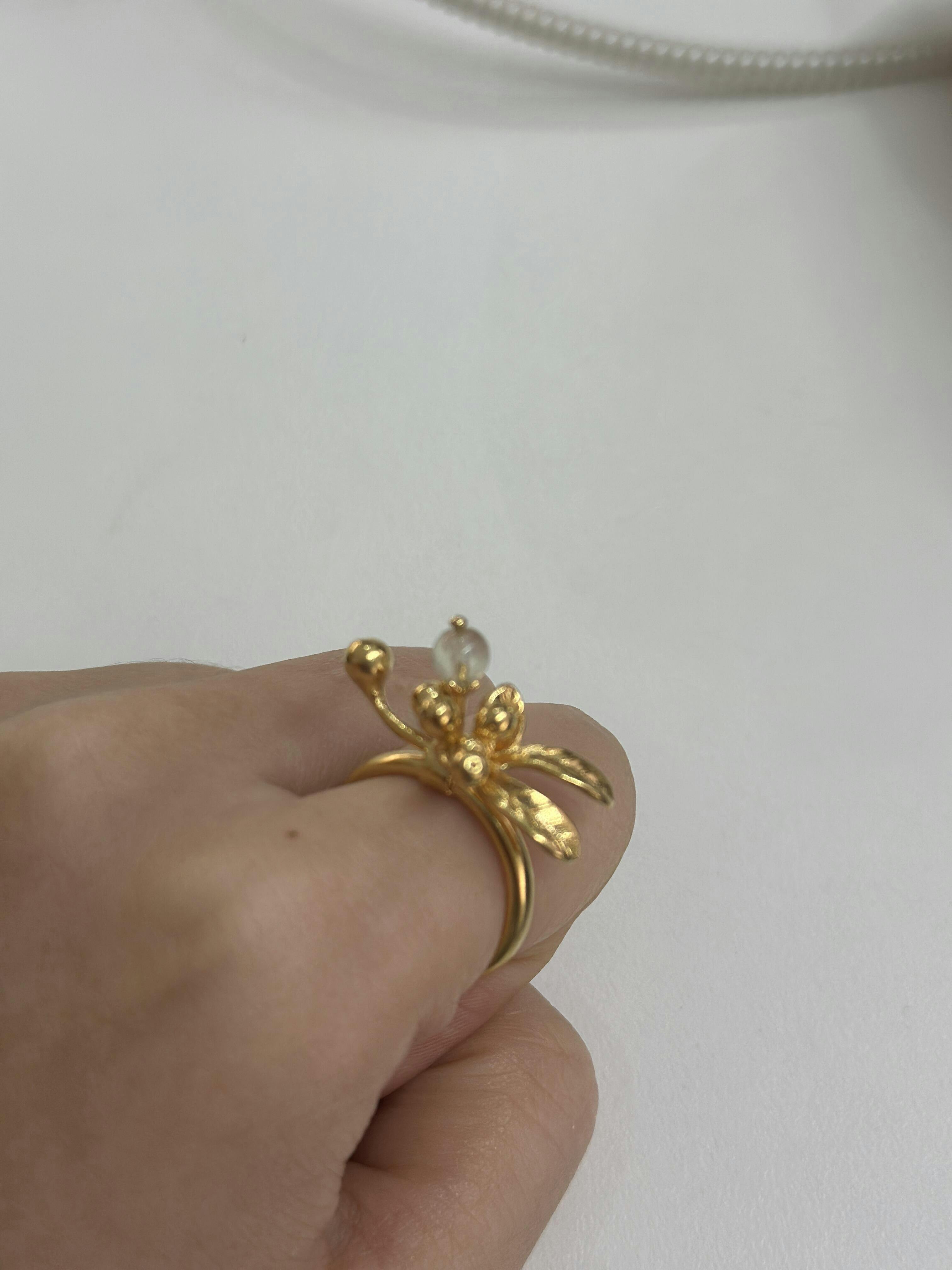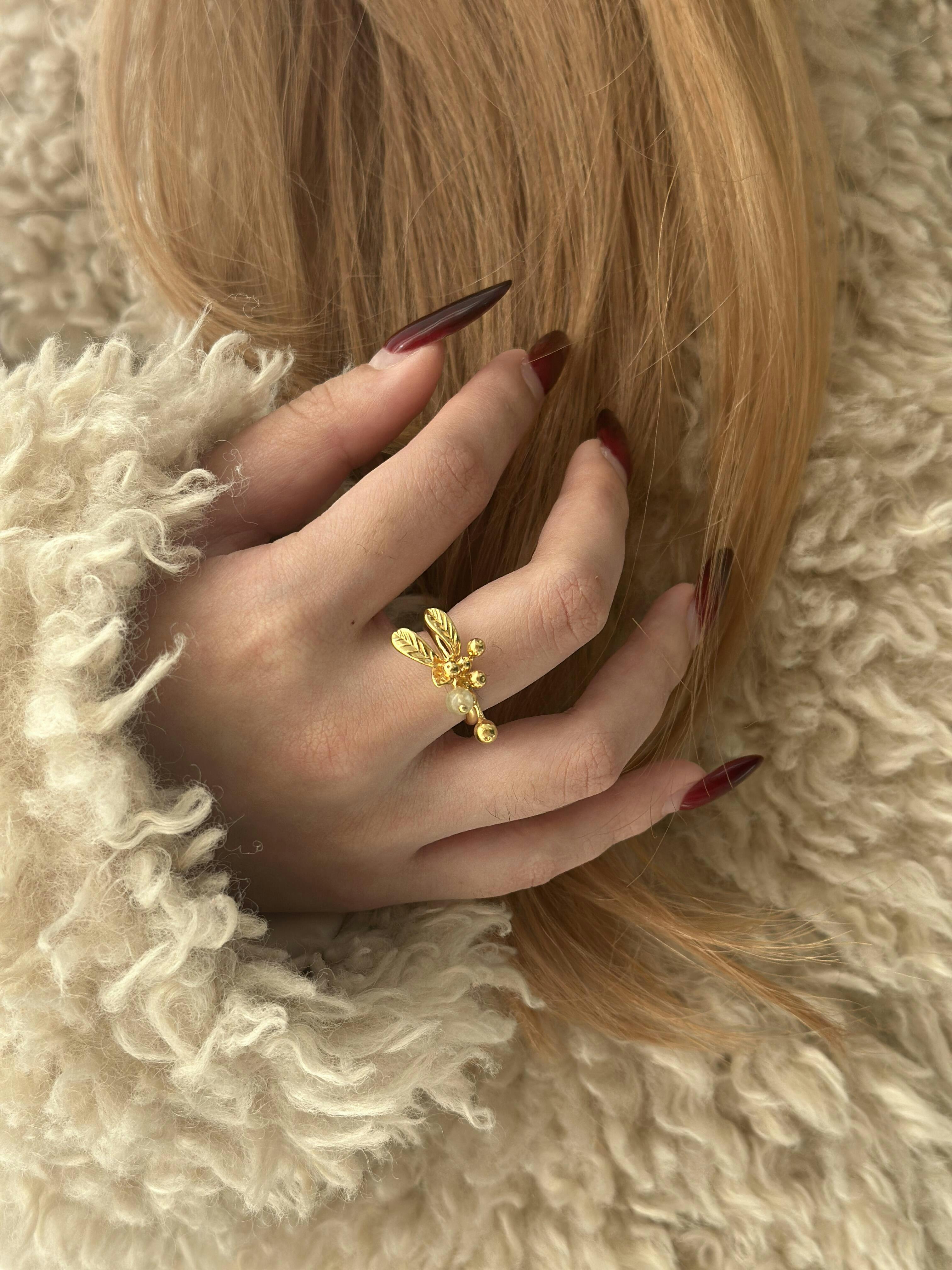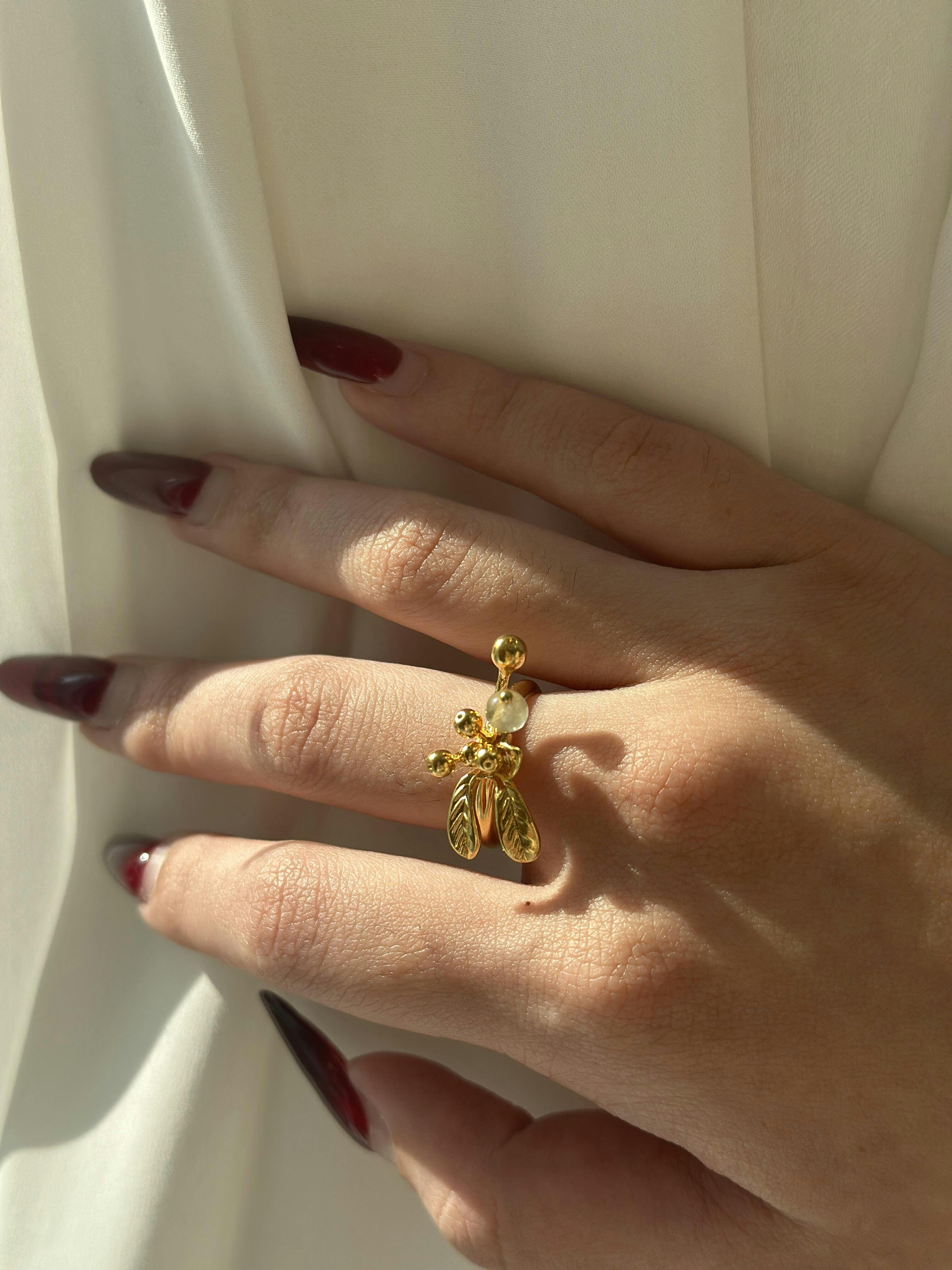A graceful homage to nature’s elegance, this ring captures the timeless beauty of mistletoe in a refined silhouette. A serene prehnite gemstone glows at the center, symbolizing calm and confidence, while golden leaves and delicate berries add a touch of organic sophistication.
