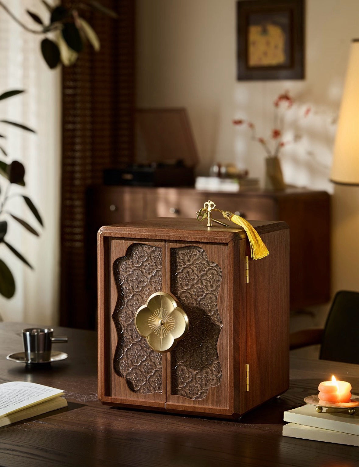 Made from warm walnut-toned wood, the cabinet features double doors with ornate carved panels and a striking oversized brass floral lock at the center. Inside, the structured layout keeps your jewelry protected, organized, and easy to access—while the exterior feels more like fine furniture than a traditional jewelry box.