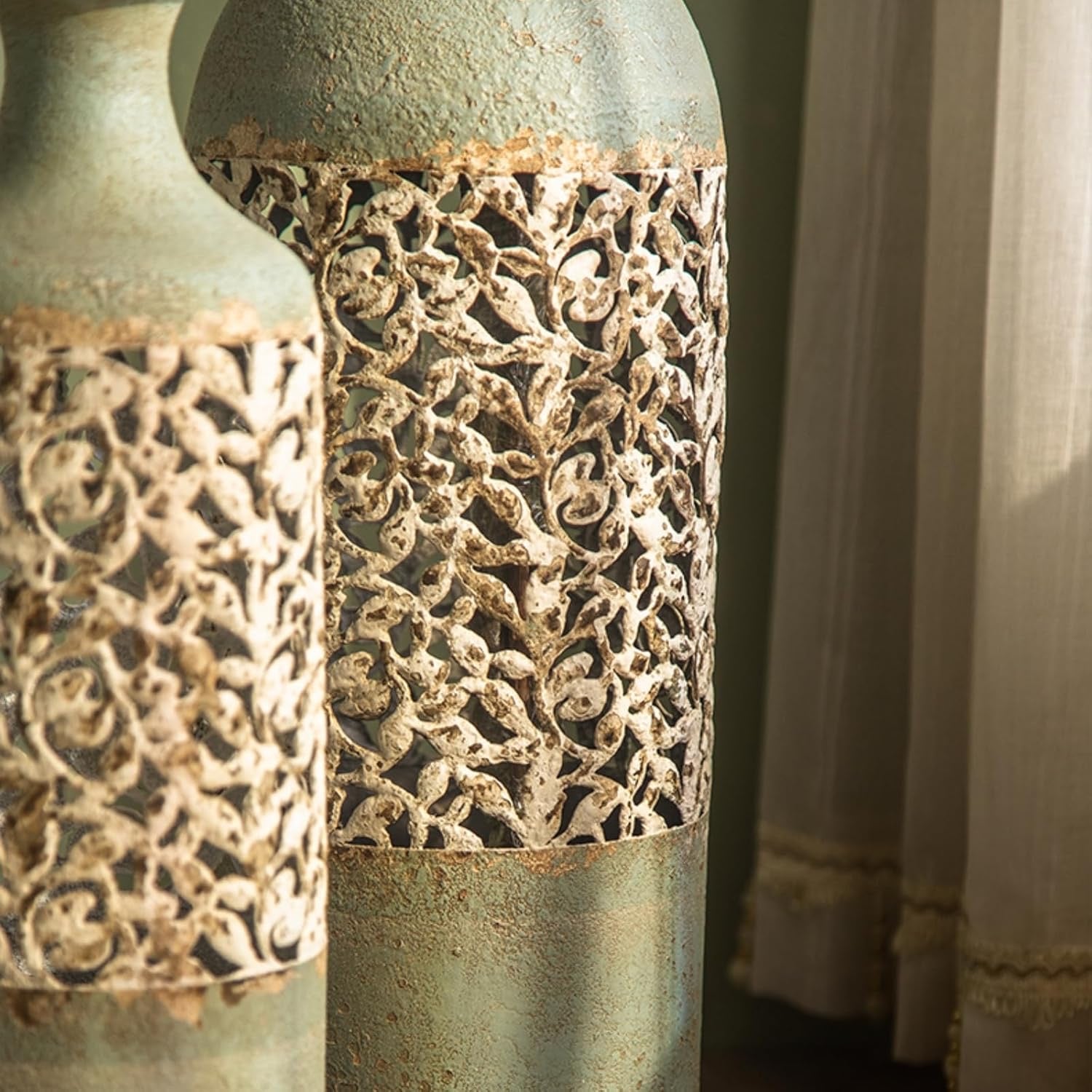 Bring timeless charm and rustic elegance into your home with this exquisite set of two tall decorative vases. Featuring a beautifully distressed finish and intricate carved detailing, these metal vases exude antique character perfect for French country, farmhouse, or bohemian-inspired interiors.