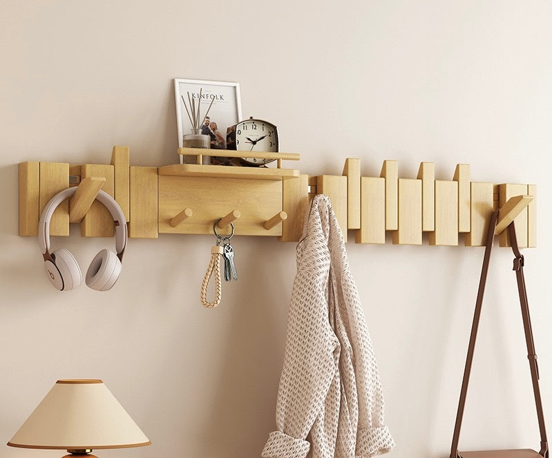 Upgrade your home organization with a piece that blends contemporary art with daily utility. Inspired by the rhythmic layout of piano keys, this wall-mounted rack features foldable hooks and a built-in top shelf, offering a sleek, minimalist solution for entryways, hallways, or bedrooms.