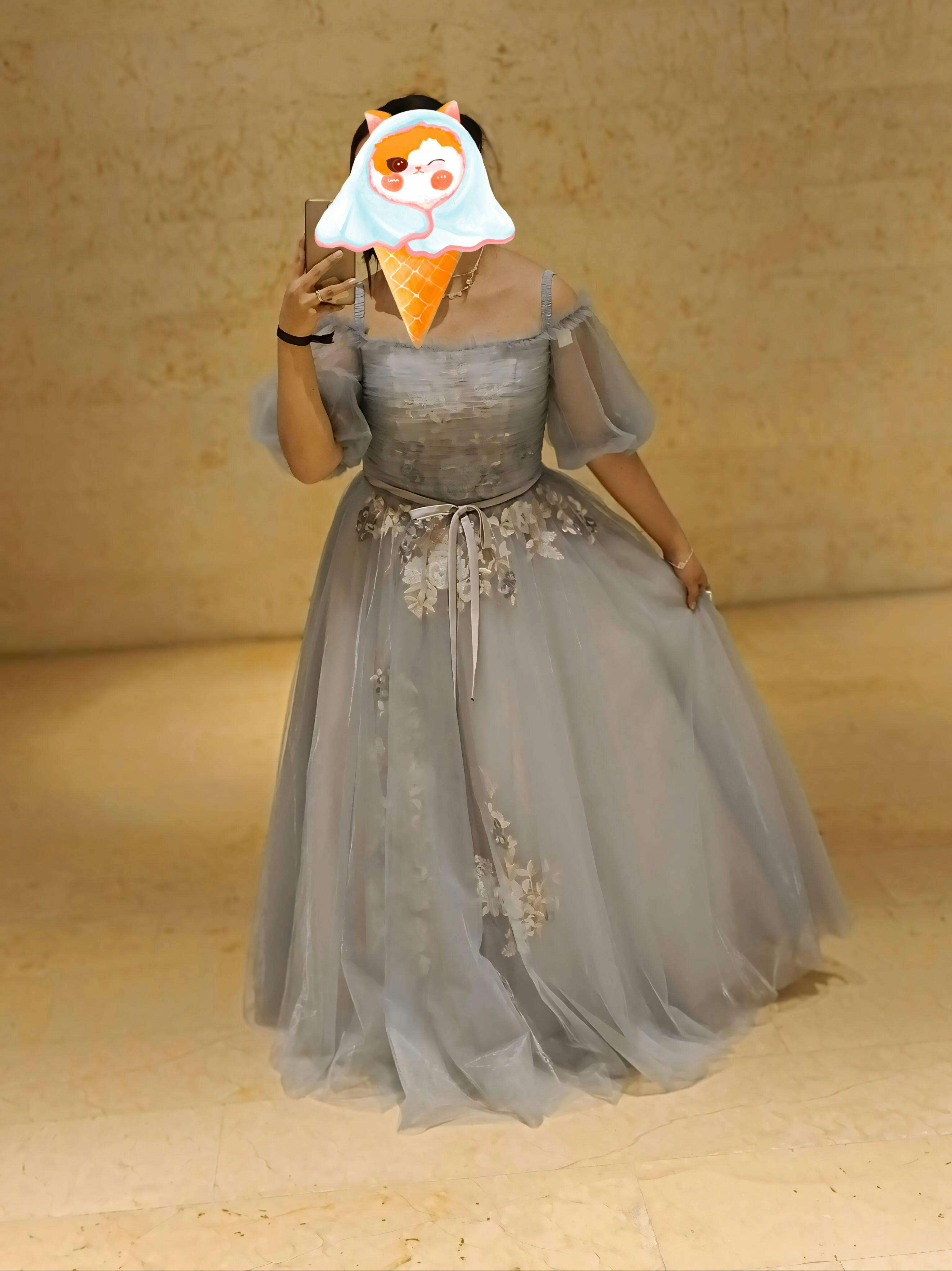 Unique gray blue tulle lace applique long prom dress, gray blue evening dress